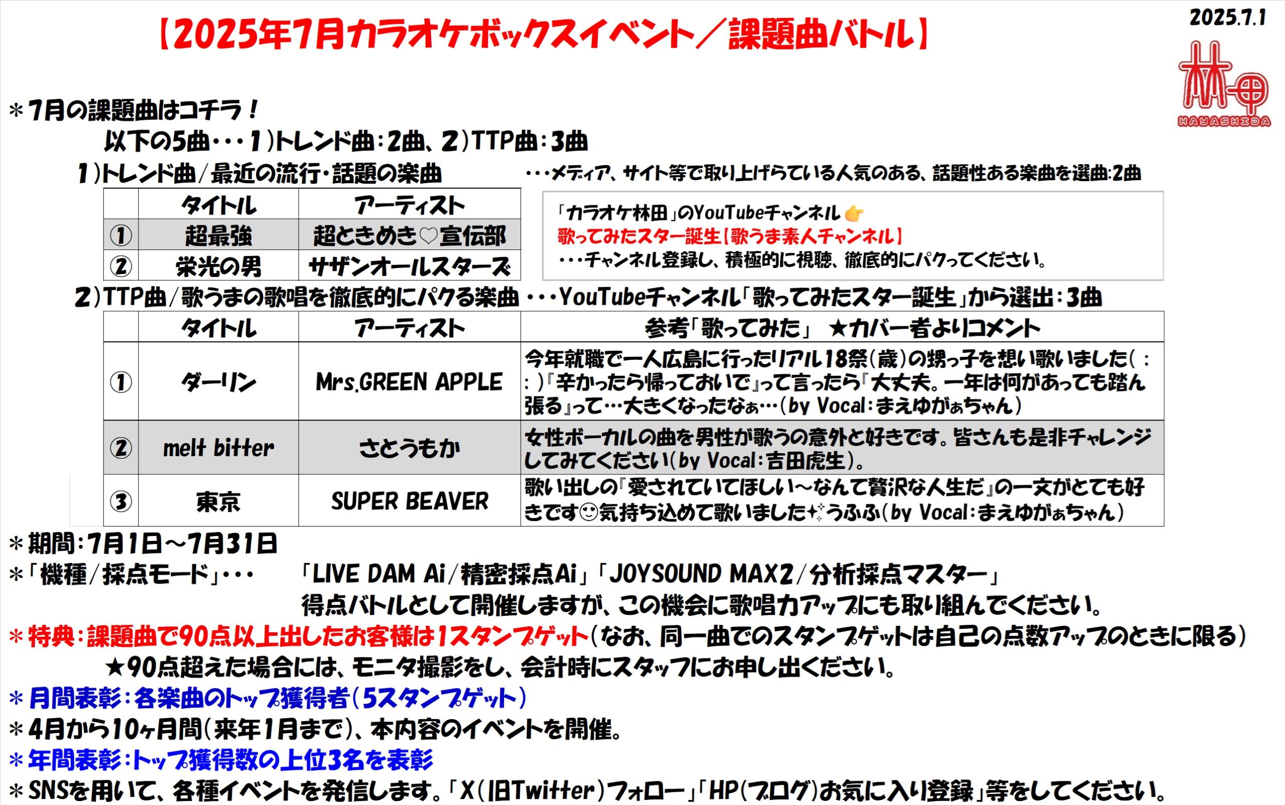【2025.7.1-7.10】7月カラオケボックスイベント課題曲