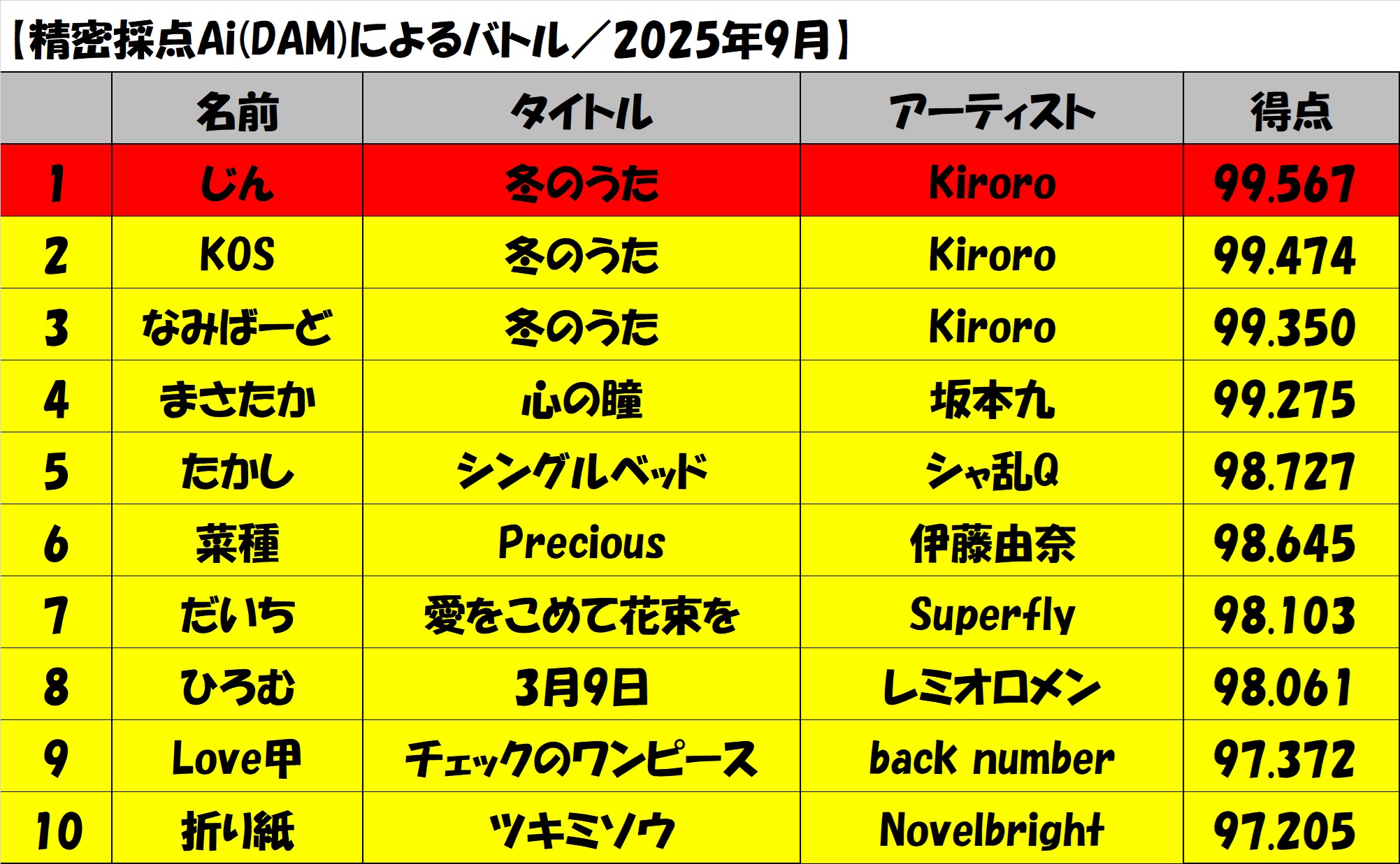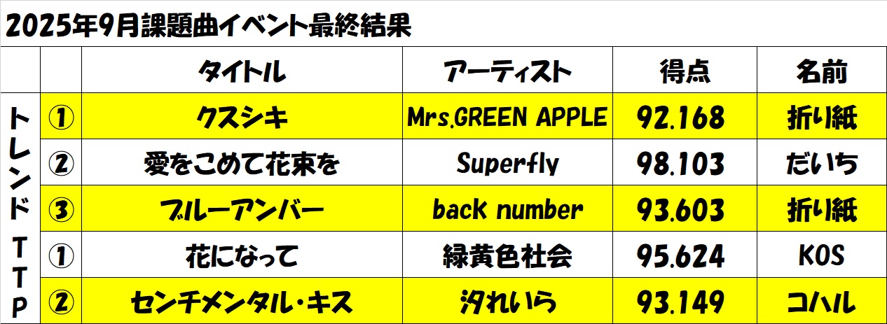 【2025.9.21-9.30】9月カラオケイベント結果