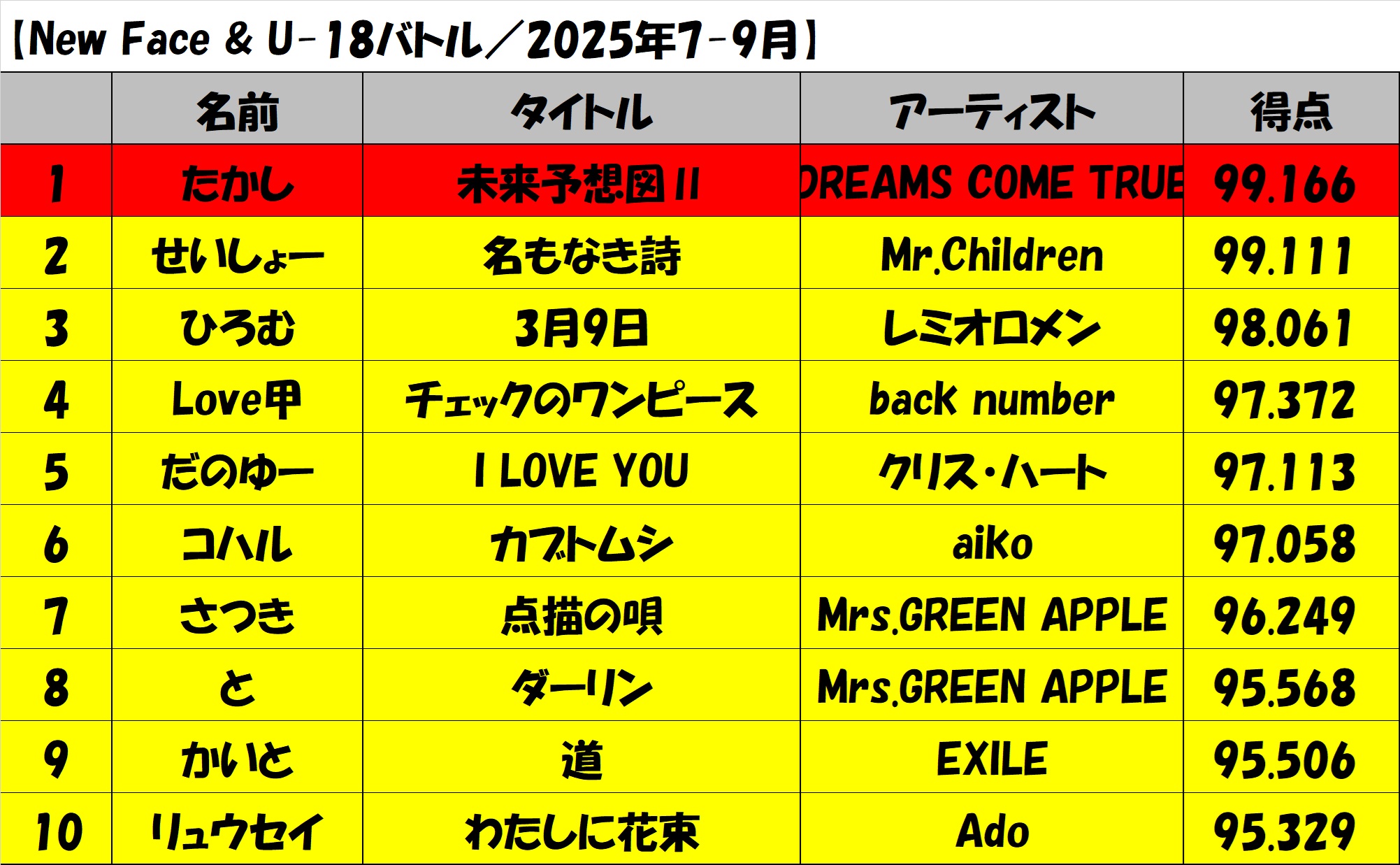 NewFaceバトル(含U-18バトル)の「7月から9月期」の結果です。