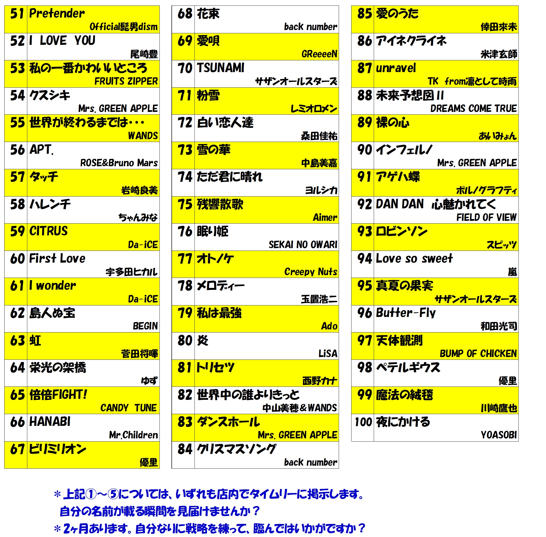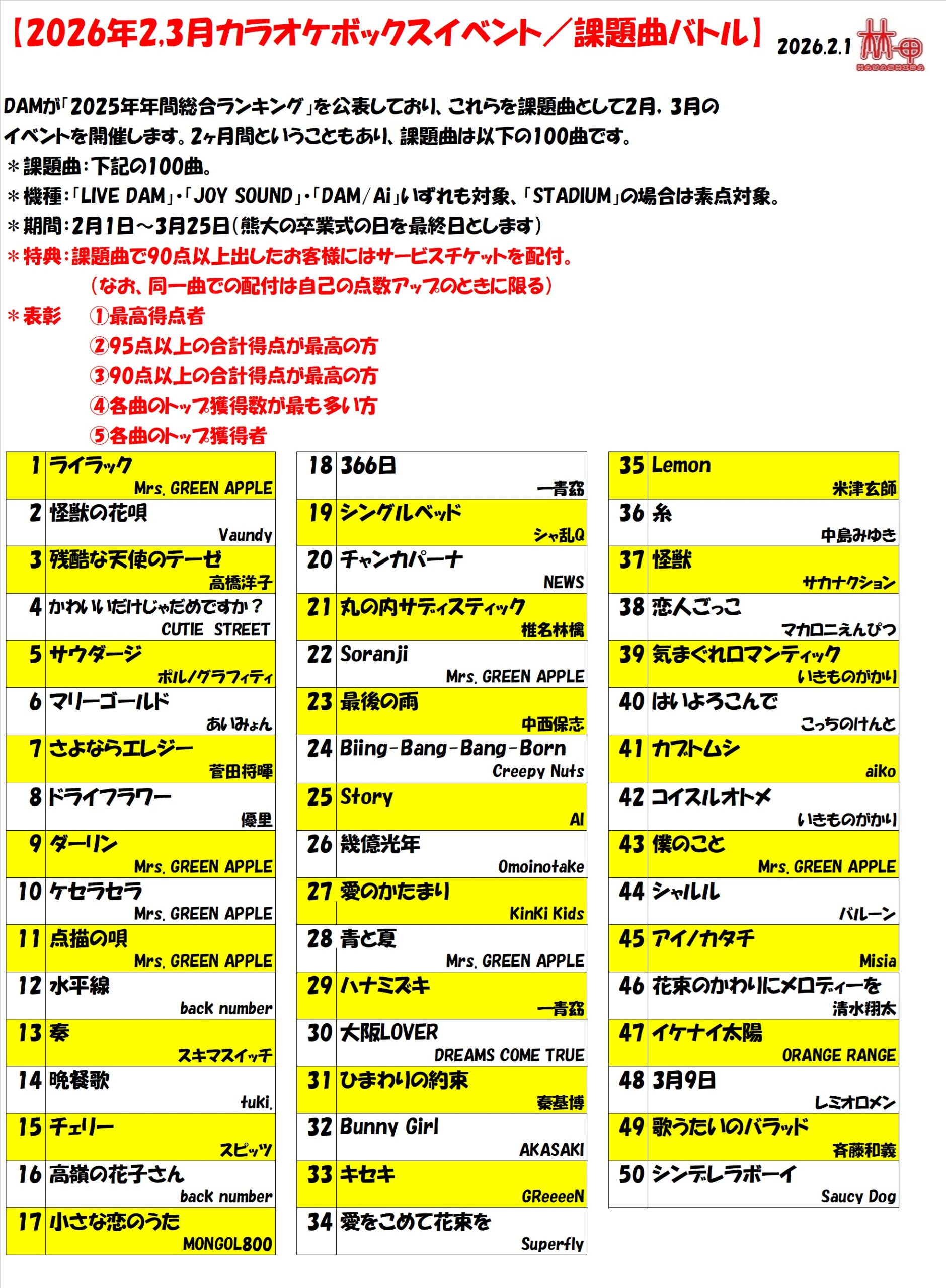2月および3月の課題曲はコチラです。毎年恒例の「前年DAMランキング100」を課題曲にしています。